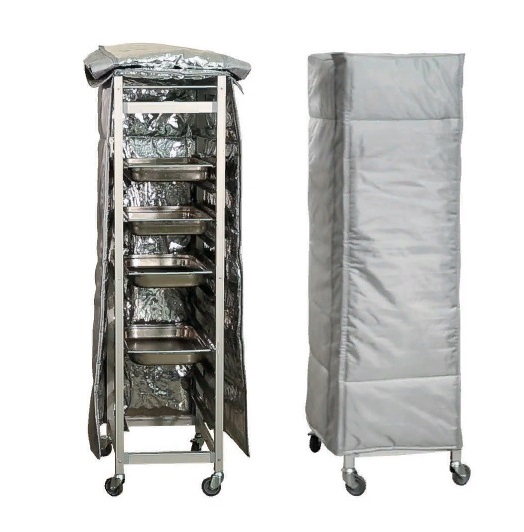 Термочехлы изготовлены из высокопрочных влаго- и воздухонепроницаемых материалов, которые собирают на своей поверхности лишнюю влагу и предотвращают развитие микроорганизмов. Конструкция представляют собой съемный чехол, который устанавливается на мобильную тележку и закрывается при помощи магнитной застежки. Благодаря наличию открывающейся части, доступ к содержимому тележки возможен без полного расчехления всей тележки. Материал устойчив к мойке аппаратом высокого давления и дезинфицирующим средствам.