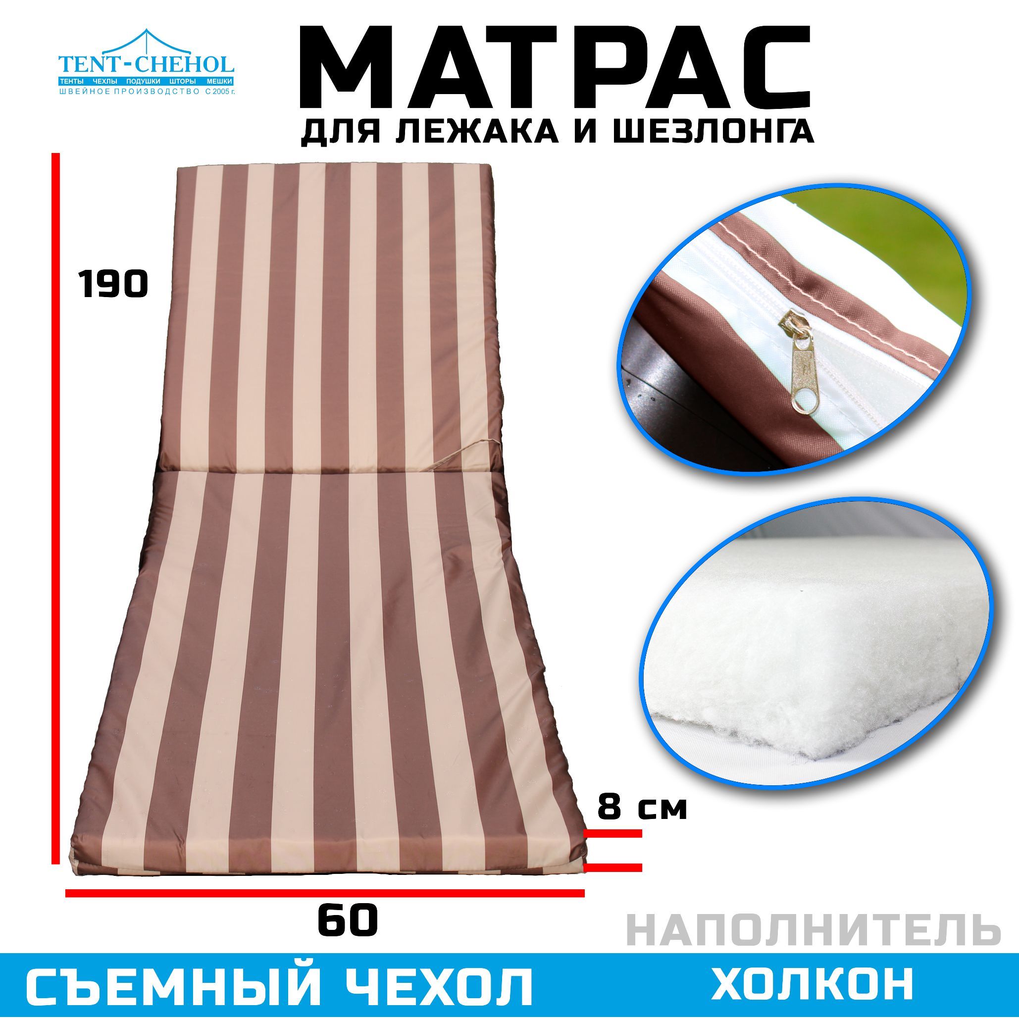 Он имеет длину 190 см, ширину 60 см и высоту 8 см, что идеально подходит для большинства шезлонгов. Наполнитель из холкона обеспечивает мягкую, но поддерживающую поверхность, которая будет поддерживать вашу спину и предотвращать боли в теле.
