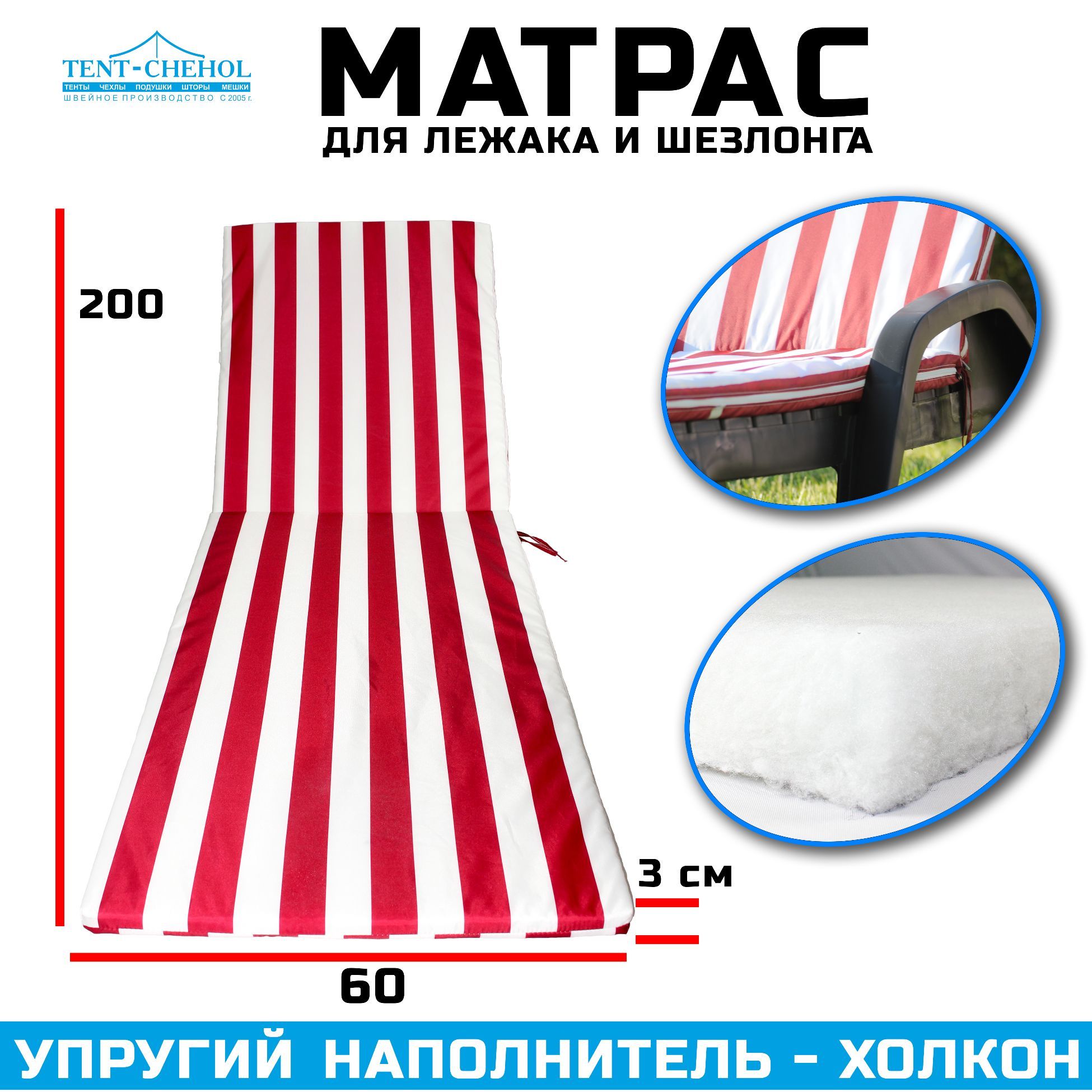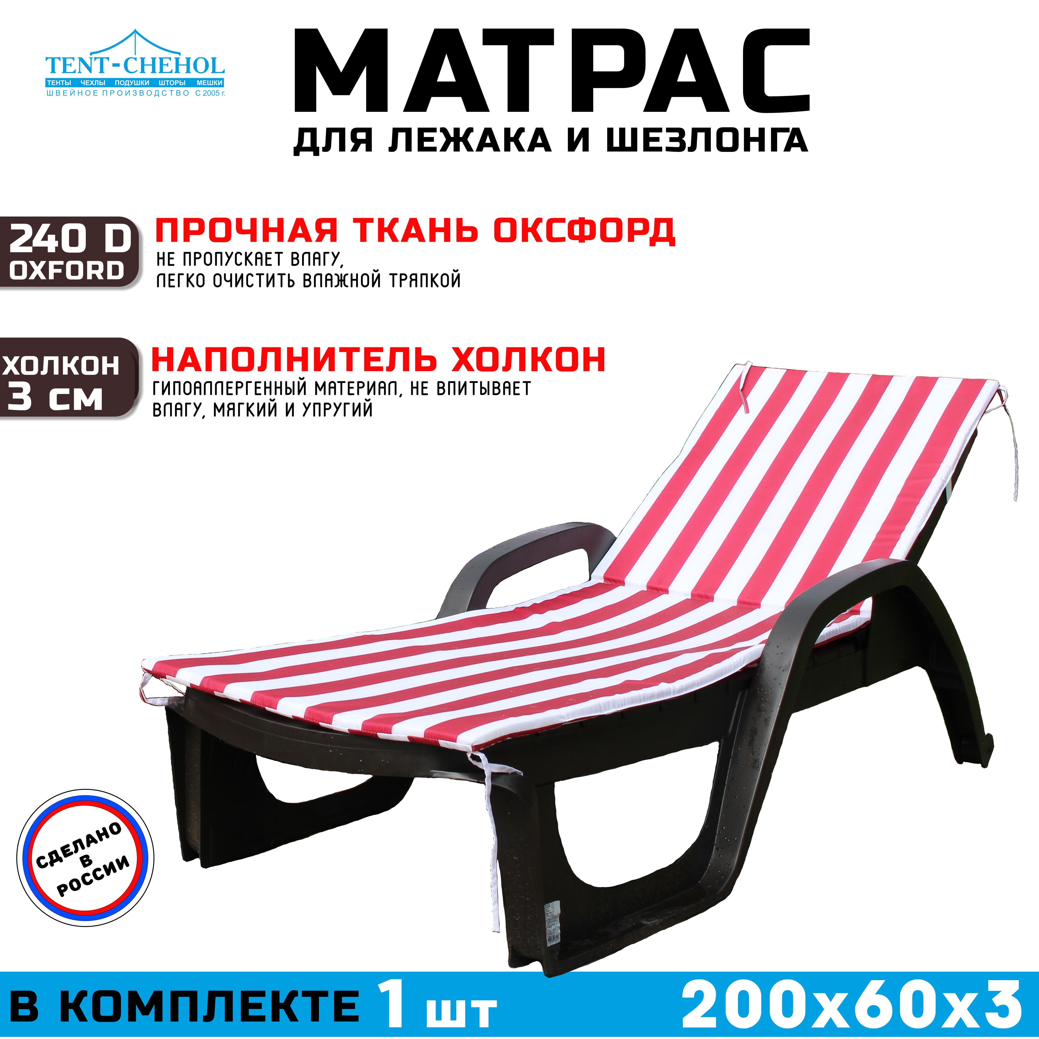 Он имеет длину 200 см, ширину 60 см и высоту 3 см, что идеально подходит для большинства шезлонгов. Наполнитель из холкона обеспечивает мягкую, но поддерживающую поверхность, которая будет поддерживать вашу спину и предотвращать боли в теле.