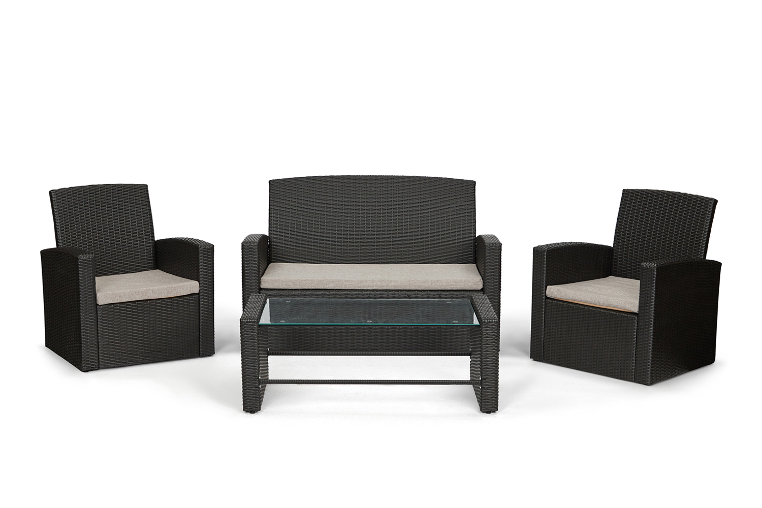 Плотная сетка из искусственного ротанга коричневого цвета является спинками и стенками кресел и дивана, а также обрамляет боковые стороны журнального столика. Во всех изделия каркас состоит из стали. Рабочая поверхность столика (столешница) состоит из закаленного стекла, который выдерживает до 25 кг веса (отлично подойдет для того, чтобы разместить шашлыки и охлажденные напитки во время дружеских встреч на природе). Размеры дивана – 124х78х58 см, кресла (в наборе 2 штуки) – 67х78х58 см, стола – 104х39х51см.
