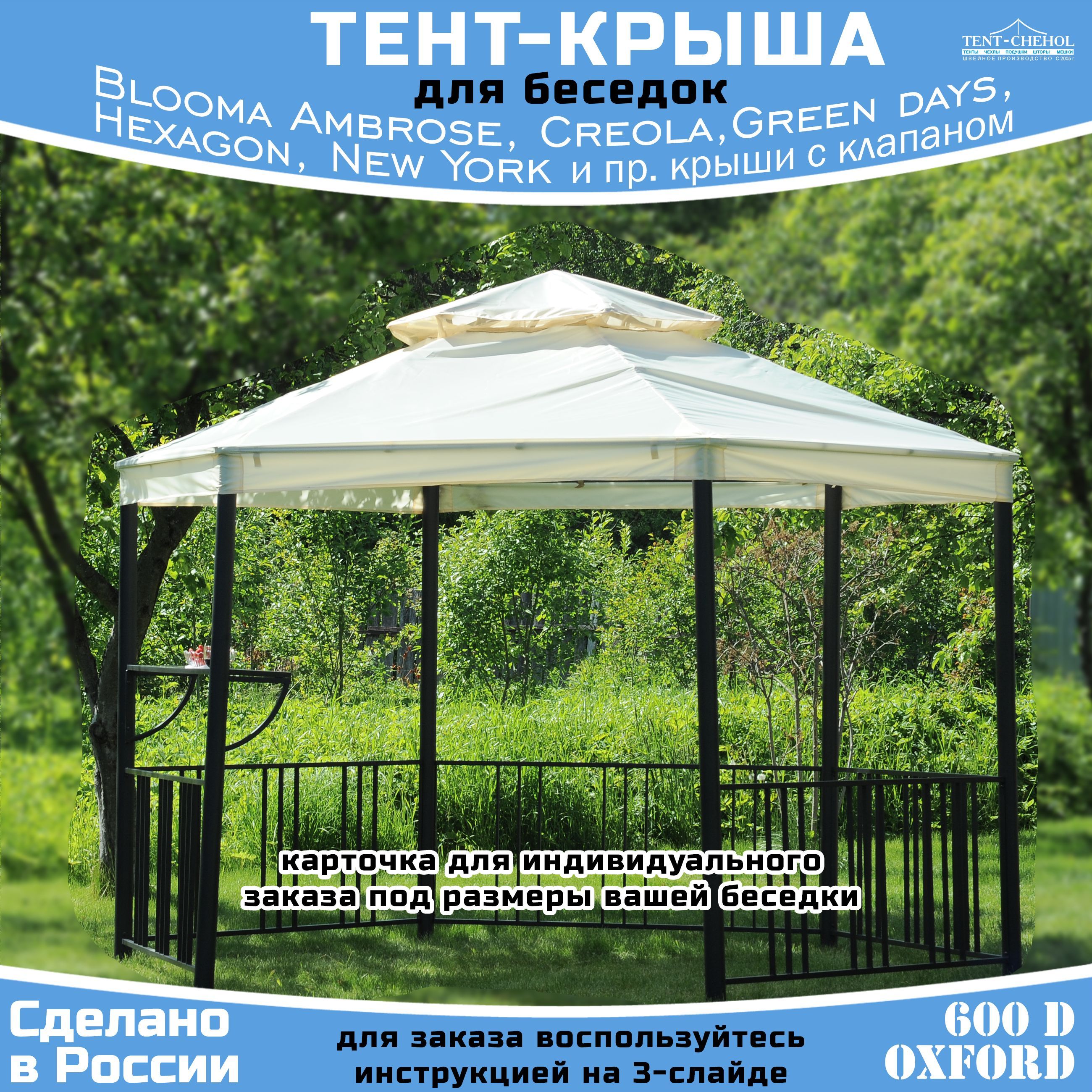 Запасной тент предназначен для замены покрытия крыши у шестиугольного павильона (беседки, шатра) Blooma Creola, Ambrose, New York1, Hexagon, Castorama Hexagon Gazebo, Green days и других шестигранных беседок с клапаном на крыше.Тент изготовлен из прочной ткани Оксфорд 600D c водоотталкивающей пропиткой PU1000.