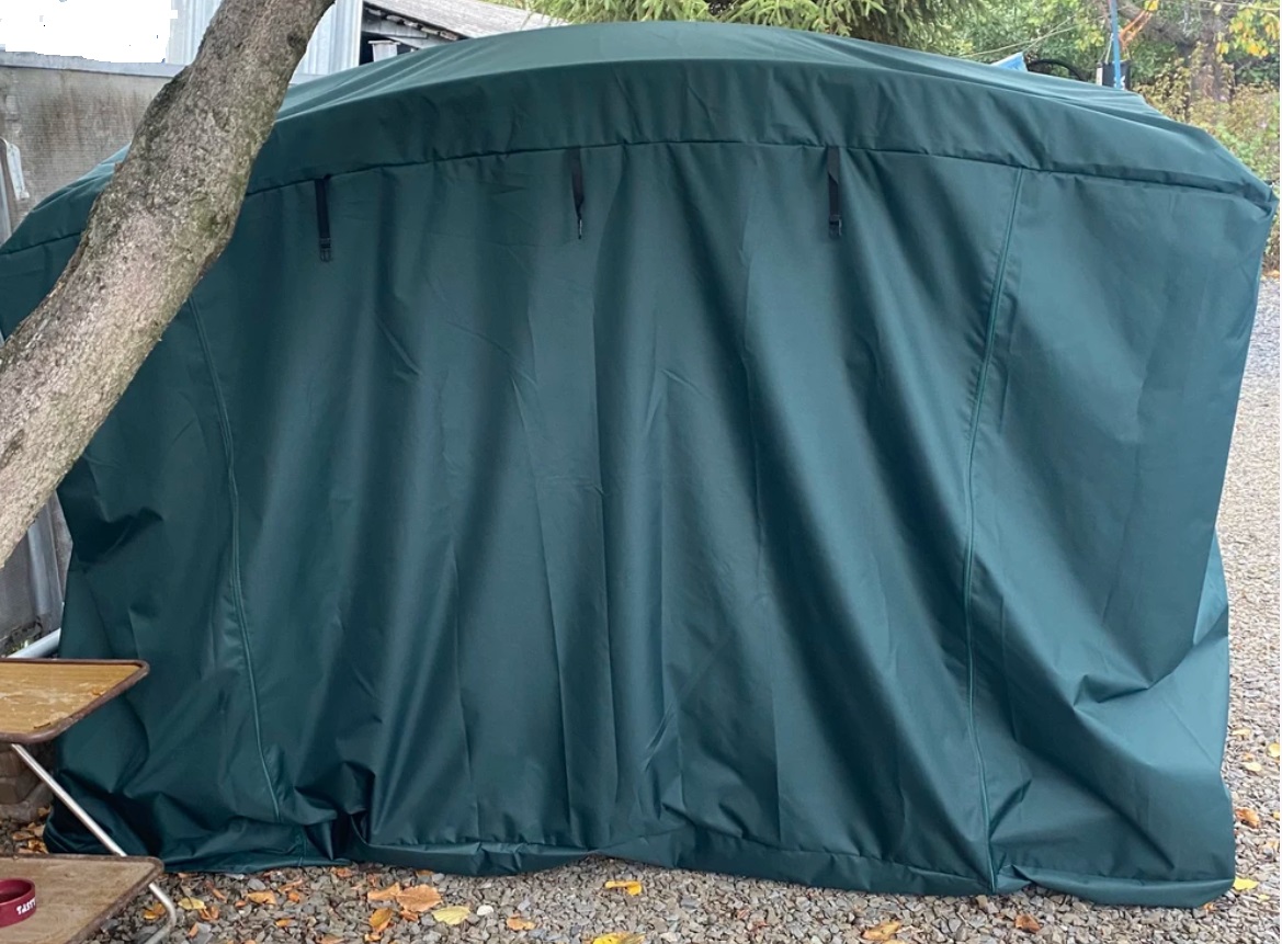 Чехол надежно крепится к каркасу с помощью прочных завязок с фастексами и лент с полукольцами, что предотвращает сдувание чехла ветром.
