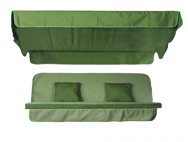 У нас вы можете приобрести сменный комплект подушек, предназначенных для садовых качелей. Предназначены такие подушки для сидения, длина которого составляет 170 см. Размер крыши составляет 200 на 118 см. В данном комплекте можно найти матрас, тент, а также две подушки. Все составляющие данного комплекта изготавливаются из одной ткани тексилк. В качестве наполнителя использовался симтекс. На матрасе есть молния, при необходимости наполнитель вытаскивают, а чехол стирается. Толщина матраса составляет 7 см.