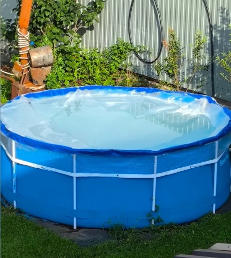 Тент для бассейна, сделанный из прочного ПВХ материала, предназначен для защиты бассейна от мусора, листьев, ультрафиолетовых лучей. За счет светоотражающих свойств полотна, осуществляется нагрев воды в ёмкости. Изделие крепится к каркасу бассейна с помощью веревок.